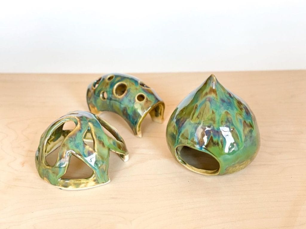 This one looks like a twisted metal sculpture with shiny blue and purple glaze. It has smooth edges and open sides where your betta can swim through or rest inside.