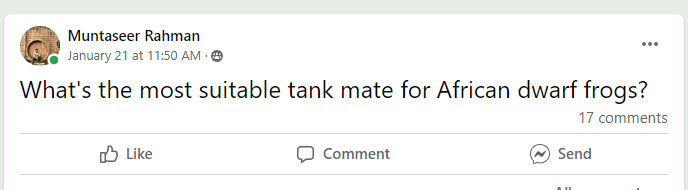 I asked in two popular ADF groups about their opinion on what’s the most popular tank mate for African Dwarf Frog. Here’s what the post looked like: