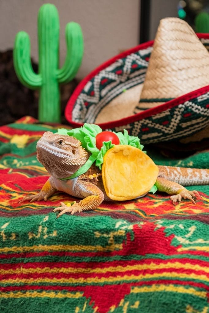 Get your bearded dragon ready for Taco Tuesday with a hilarious taco outfit. This costume covers the back with a taco shell design, complete with faux lettuce and cheese details.