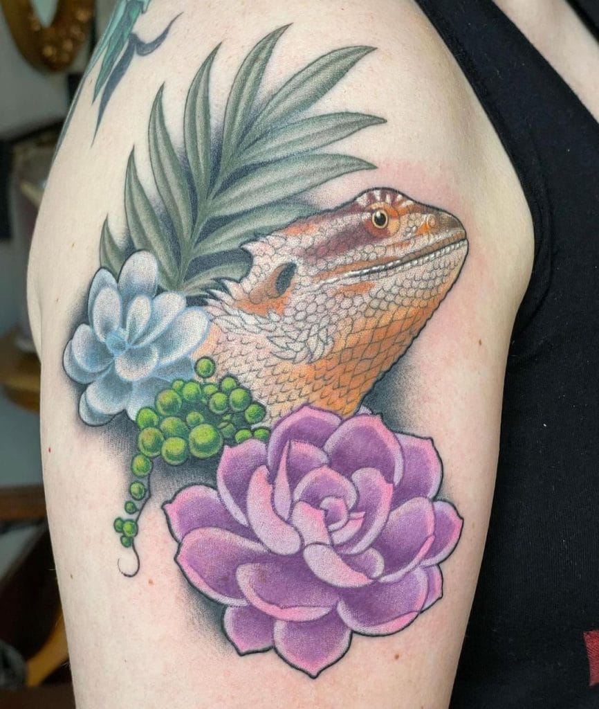 Along with the fierce persona of Bearded dragons, roses add a meaning of intense passion and love for somebody. If you want to showcase your love for somebody, a Bearded dragon with a roses tattoo can be an excellent choice.