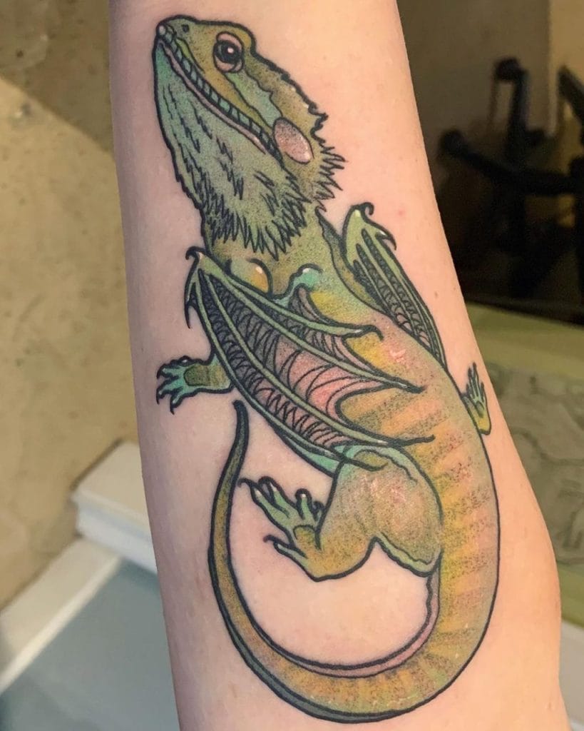 This tattoo portrays a creative illustration of a Bearded dragon that has wings on its back. It has a hue of green, yellow, and pink shade. But, the chosen color pellets are not bold. The skilled craftsmanship of the tattoo artist keeps the tattoo design coloring minimal.