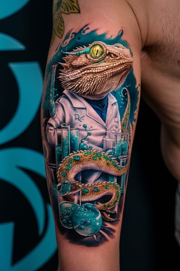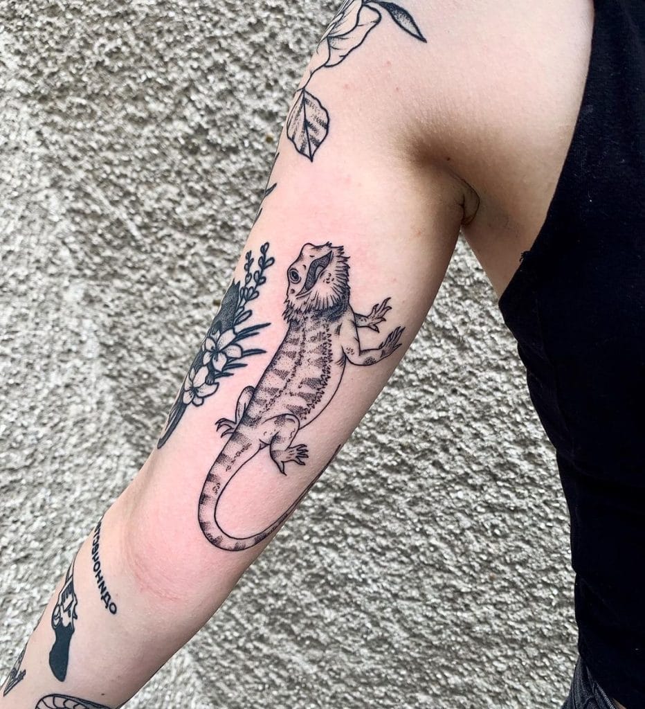 A gorgeous Bearded dragon tattoo that shows a combination with nature can embellish the beauty of the upper arm. The vibrant color, bold shades, and intricate patterns bring out an attractive feature of a Beardie. Also, this sophisticated Bearded dragon tattoo becomes visually striking due to its complex interpretation of wild and creative themes.
