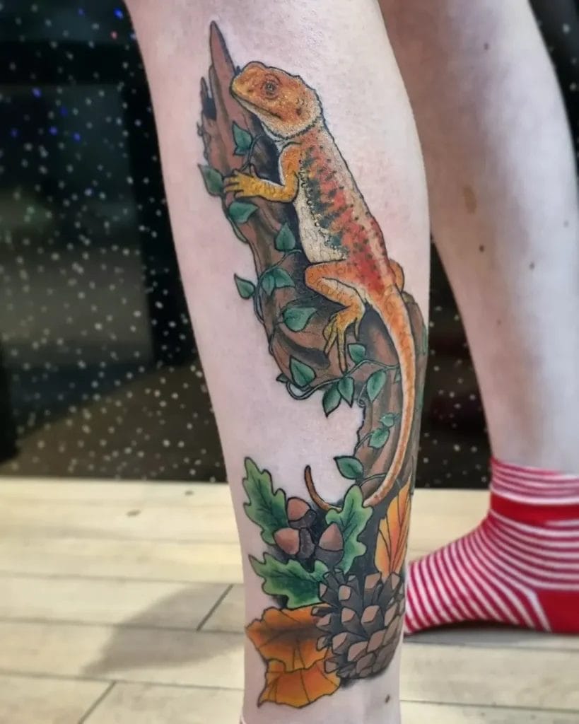 This tattoo features a gorgeous Bearded dragon with a tangerine hue that shows happiness and joy. A cartoonish feature of a Bearded dragon becomes the mystifying attraction of this entire tattoo. You can also notice the color shade differences among the leaves positioned upper and under the Bearded dragon.