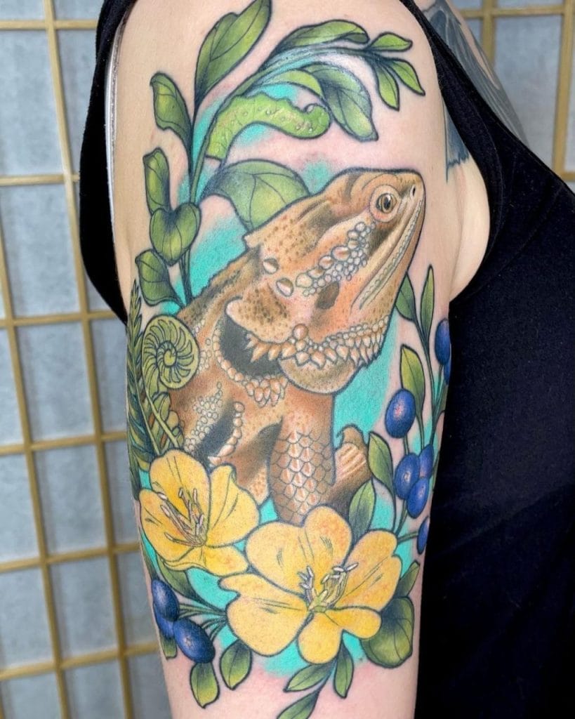 It features a custom design with minimal shading and bold outlines. By using subtle color patterns, the tattoo artist showed amazing craftsmanship with intriguing details. The hues of shades among the flowers, leaves, and Bearded dragons exude a remarkable beauty.