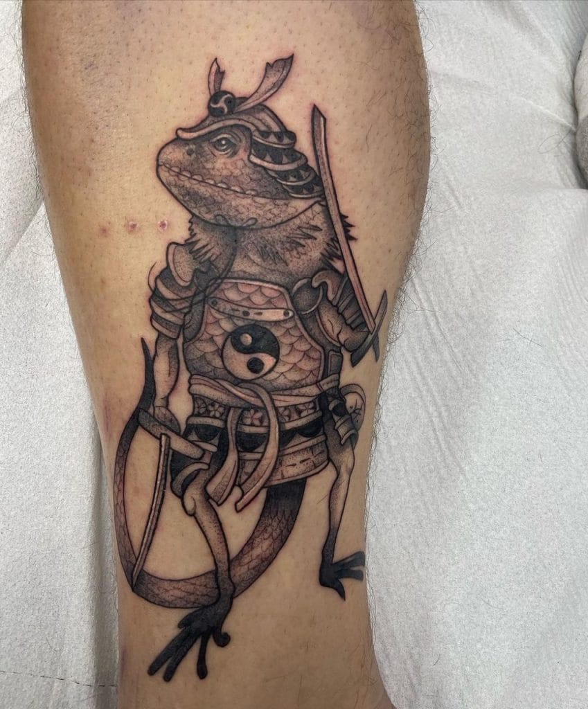 A samurai Bearded dragon will be a perfect demonstration when you want to showcase your warrior spirit. If you’re having a hard time overcoming obstacles, you can get a samurai Bearded dragon to get motivation. This samurai Bearded dragon tattoo is a beautiful way to pay tribute to Japanese military nobility, culture, and history.