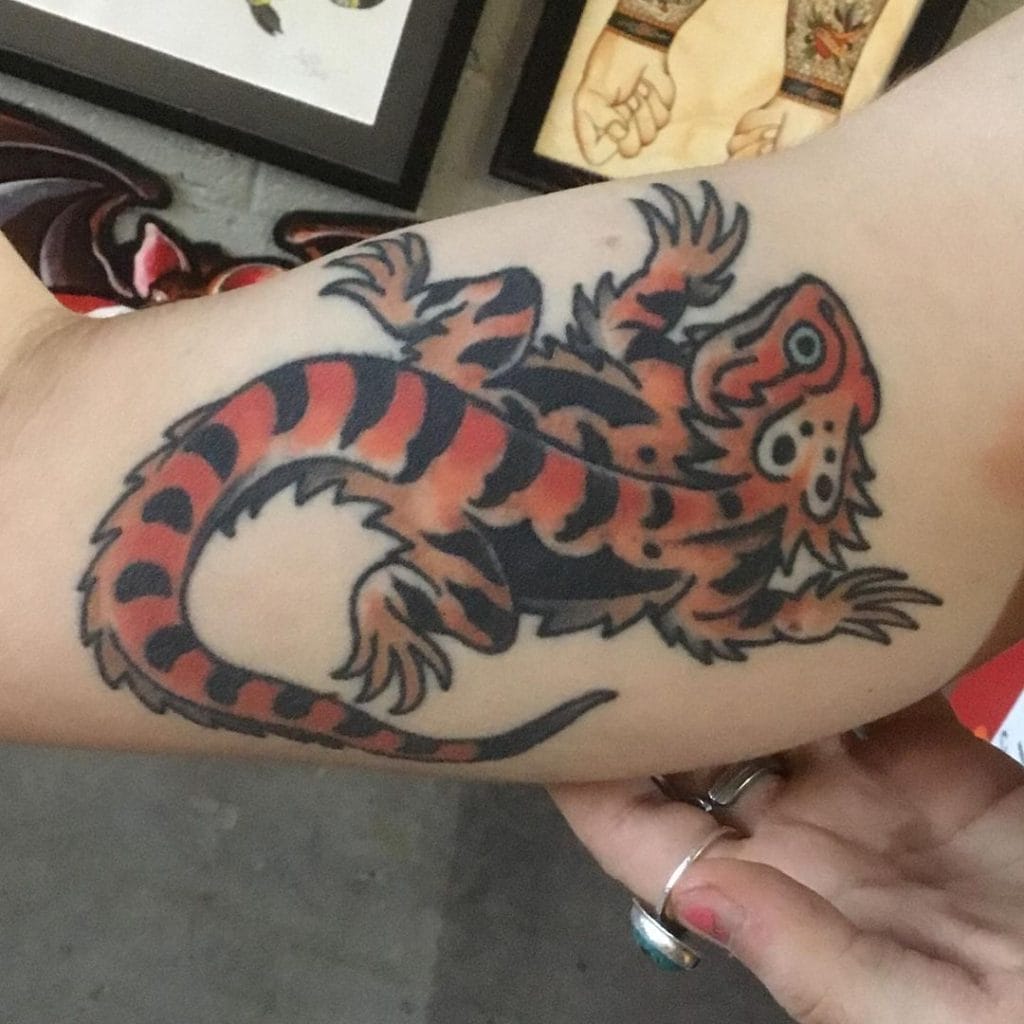Do you want to get a classic tattoo of your Bearded dragon with bright coloration and a bold outline? A traditional Bearded dragon tattoo can fulfill your demand. If you have special biased demand for bright colors, this red Bearded dragon tattoo can be an ideal design to honor this wild reptile.