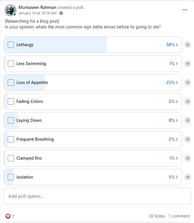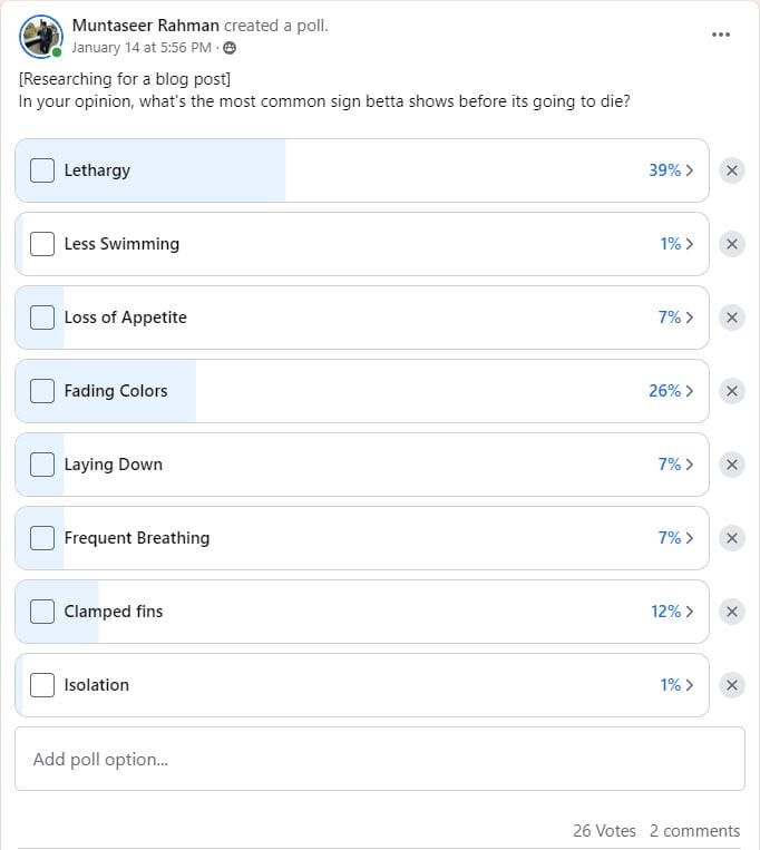 Before getting on to the main explanation, I want to start with a couple of surveys I did for this post. I asked two popular betta Facebook groups what they think are the most common signs betta shows before it dies.