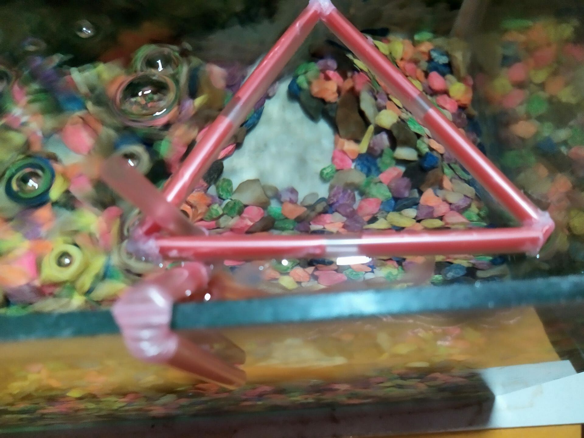 Need to take extra two straws for the holder of the feeding ring. Now, using glue, bend the straw and permanently fix it through the inside corner. This will look more like the above picture. These two straws will be used to make the holder of the square feeding ring of the betta fish. The holder will be attached to one side glass of the aquarium and will hold the Triangle ring. Also, take a small cut red straw for the joint.