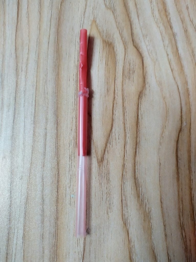 Now, put half of the red straw into the pink straw and seal the edge of the pink straw using the silicon gun. This will permanently attach the red and pink straw and it will not be detached further. The post-seal straw will look like the above picture.