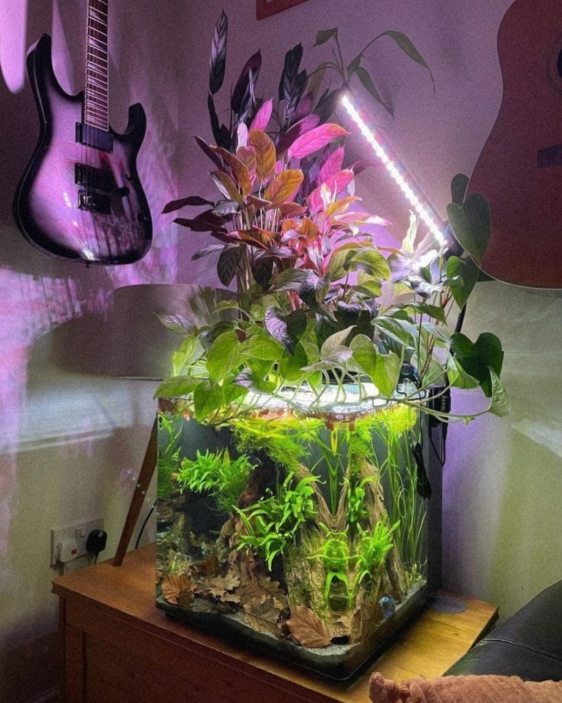 It’s unique because it blends aquascaping with aquaponics—basically an aquarium and indoor garden in one.