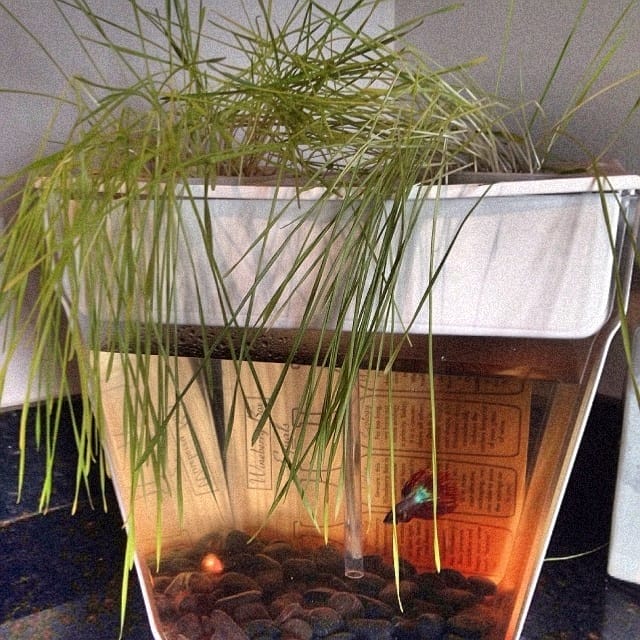 Here, wheatgrass is the main plant crop, growing thick on top of the small betta tank. The fish’s waste feeds the grass, while the roots act as a living filter for the water.