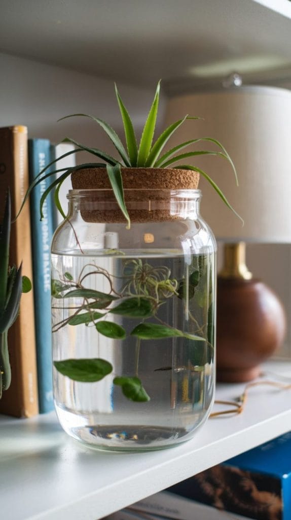 I used a large mason jar and floated a cork with a baby spider plant on it. It’s weird, pretty, and kinda magical.