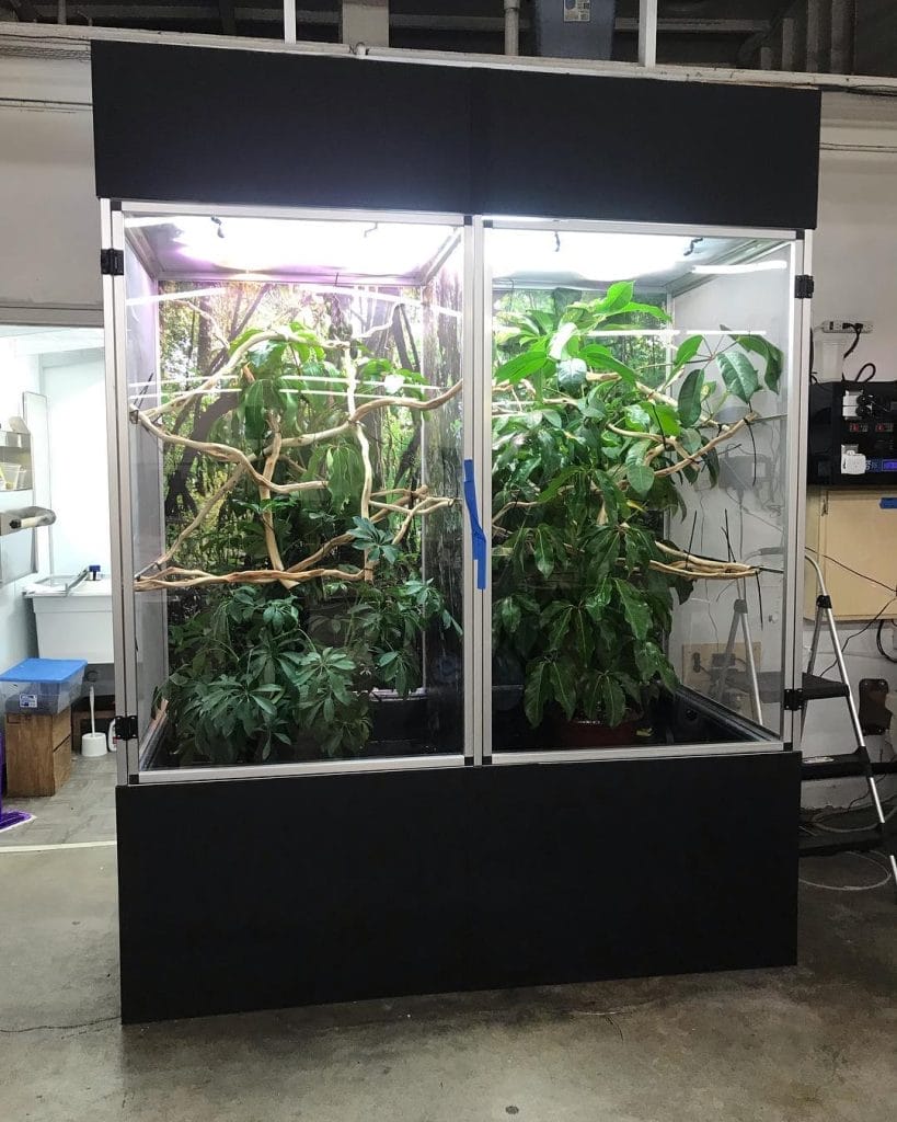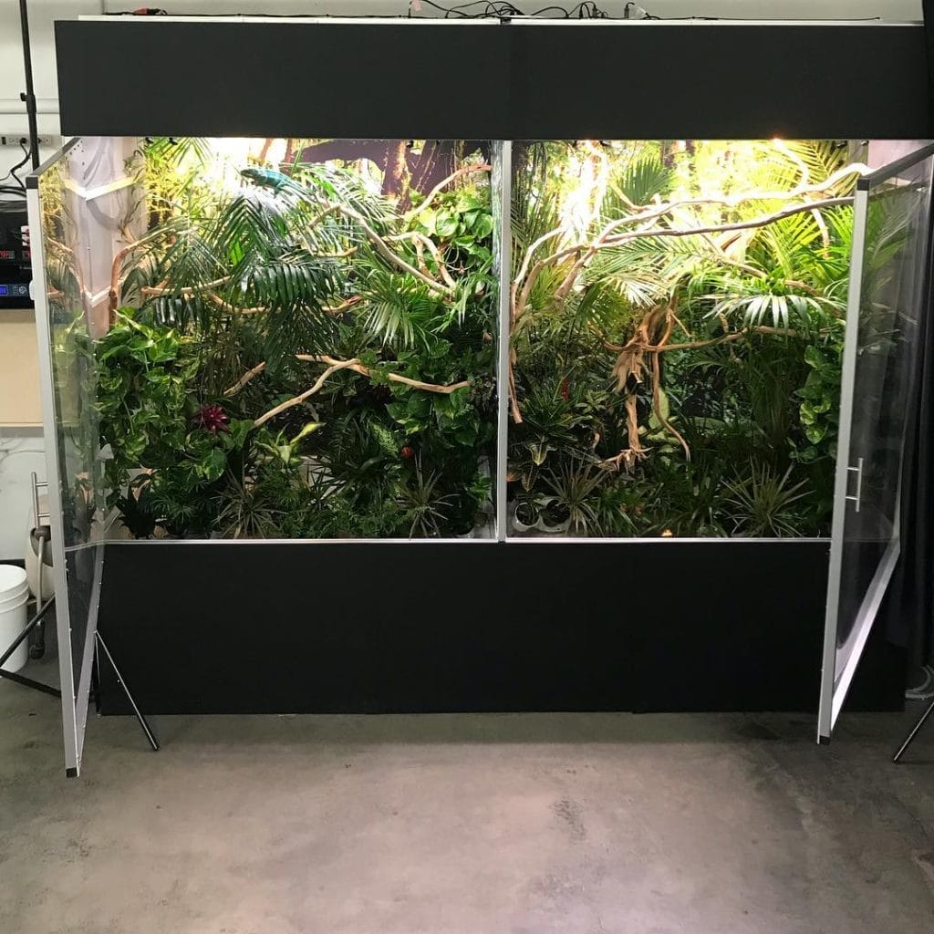 | Supplies and décors | Substrate, leafy plants, artificial vines, ledges, water dish, heat lamp, LED lighting, UVB lighting, etc. |