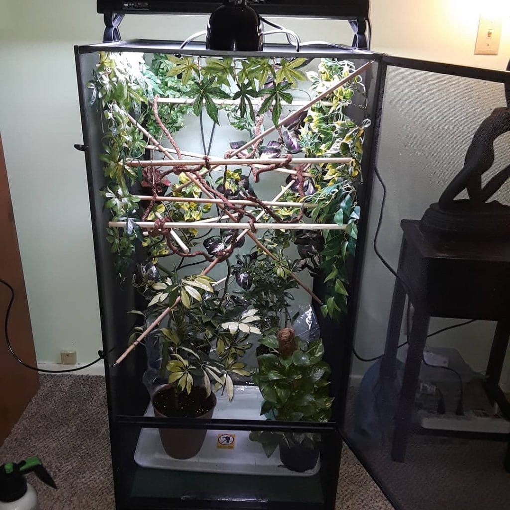 | Supplies and décors | Old closet, potted plants, vines, ledges, branches, UVB lighting, etc. |
