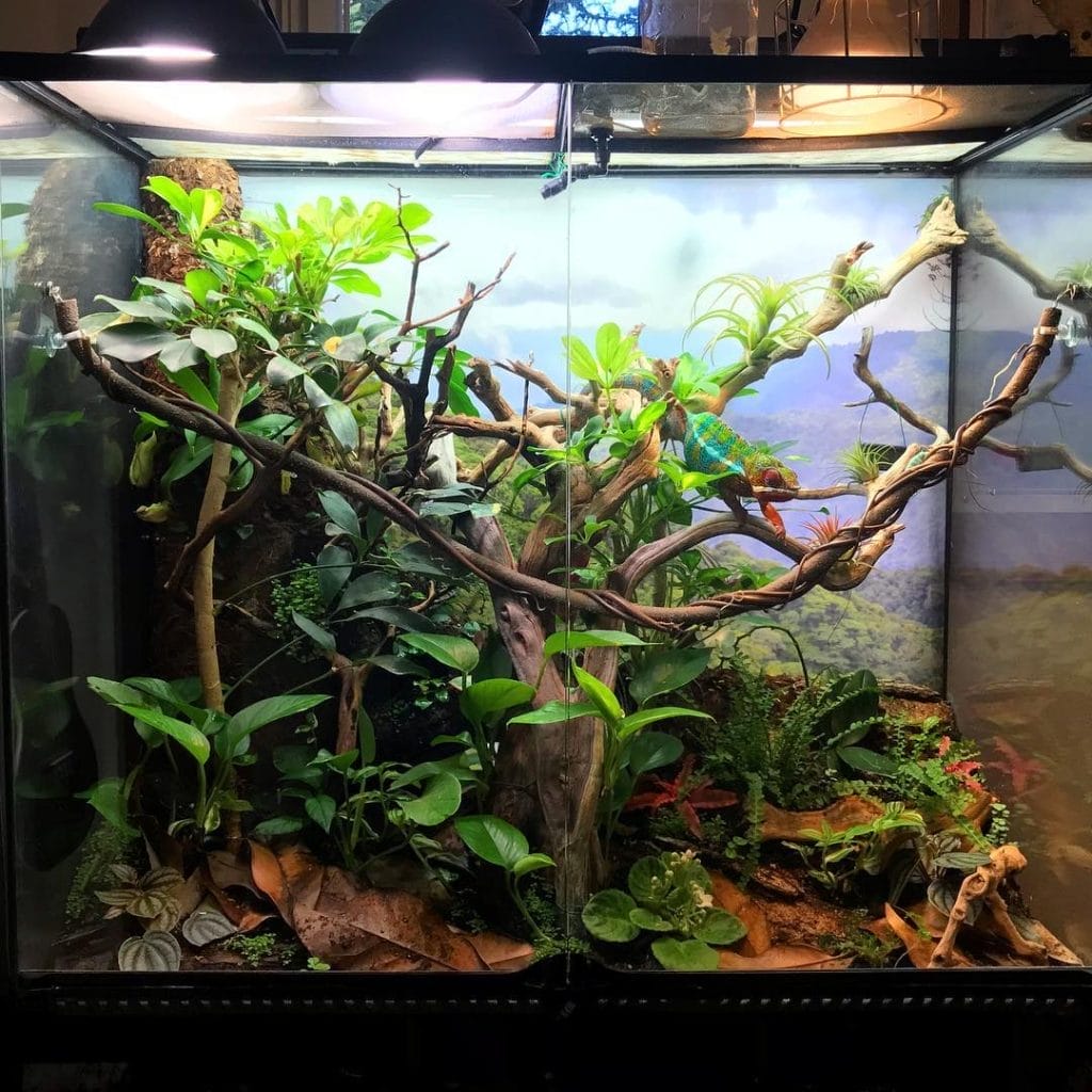 To keep your chameleon happy, you must add lots of climbing features to this tank. Make sure to install lighting sources, heat mats, humidifiers, etc. However, it can be hard to cohabit chameleons with other animals in a Paludarium.