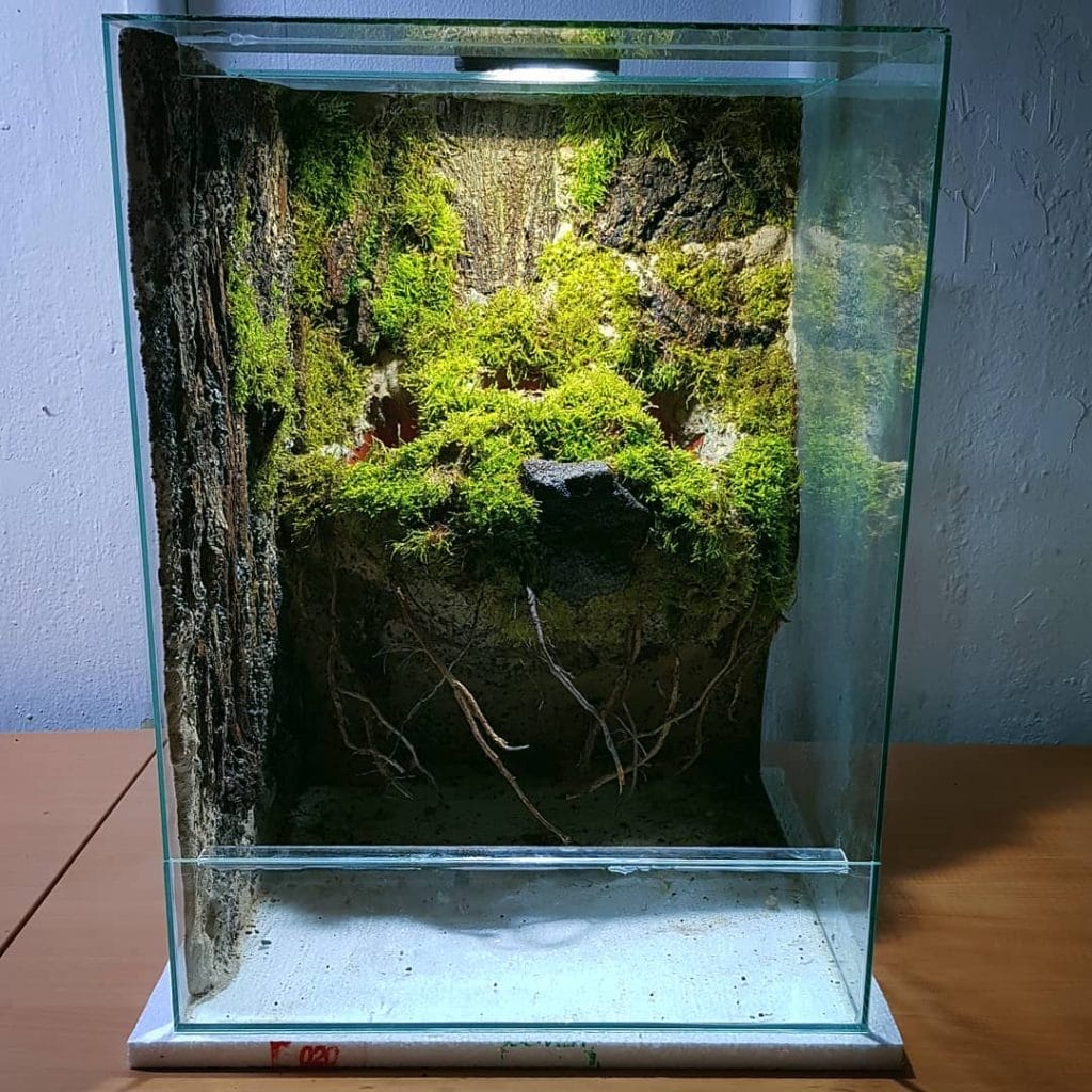 | Supplies and décors | An acrylic cage, moss, clay soil, driftwood, plants, branches, humidifier, lighting, etc. |