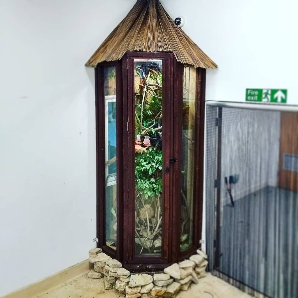 | Supplies and décors | DIY wooden cage with glasses, hays, rocks, artificial branches, vines, UVB lighting, fogger, etc. |