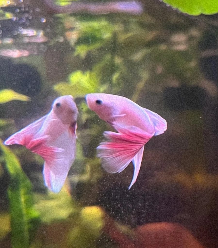 - Salamander bettas (pale body + vibrant fins creating pink contrast)