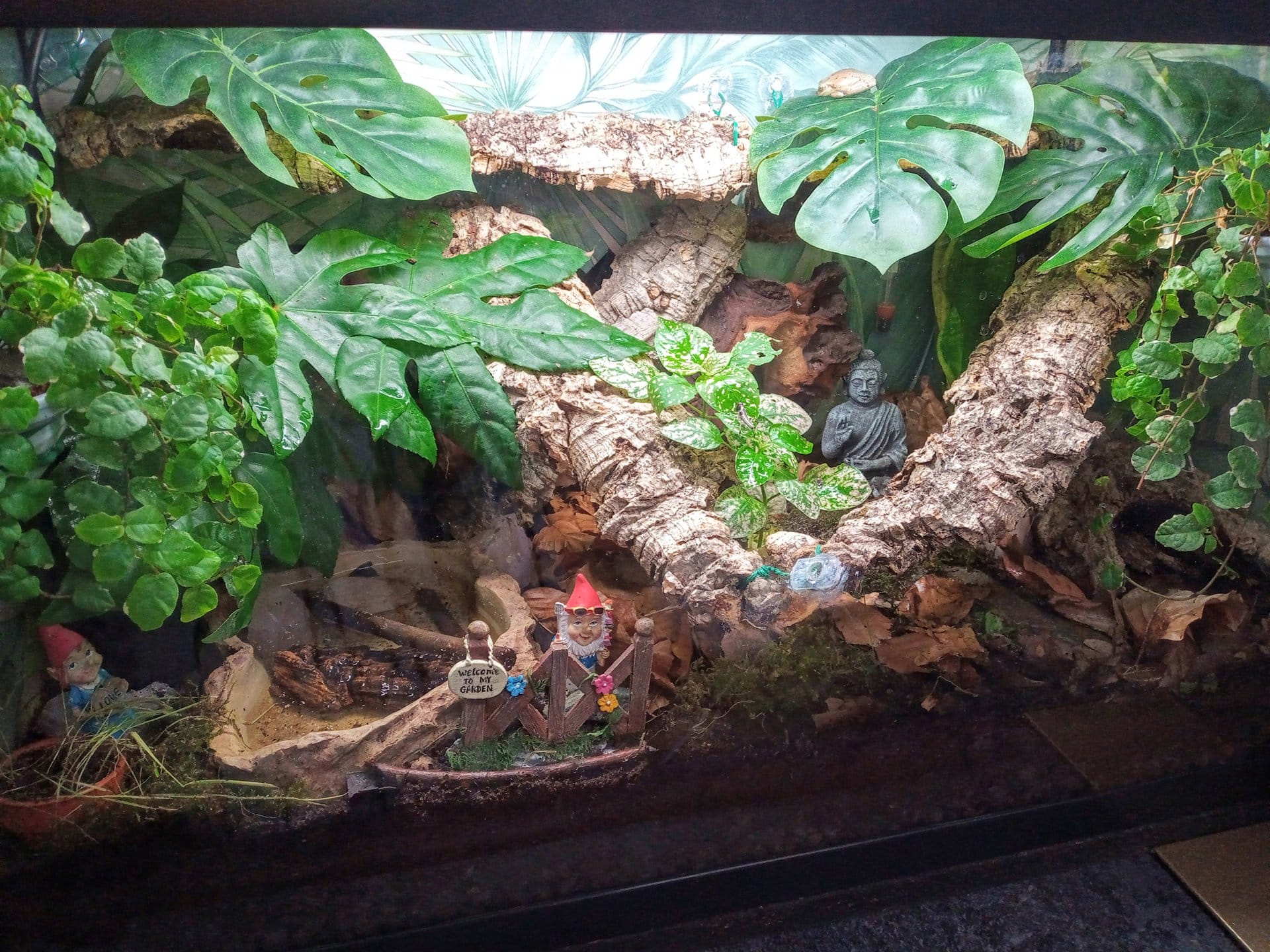 After you are all done with setting up the vivarium, mist the whole tank including the plants, vines, branches, leaves etc. Being stingy isn’t an option here, get everything moist and wet.