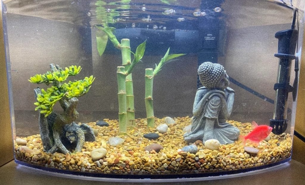 What makes this tank special is the mix of stone decor, bamboo, and a little bonsai-like ornament that gives balance.