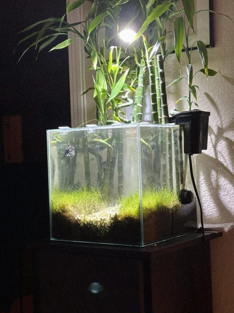 This setup looks like a living piece of art. The tall cluster of lucky bamboo rises out of the tank, while the bottom is thick with lush aquatic plants.