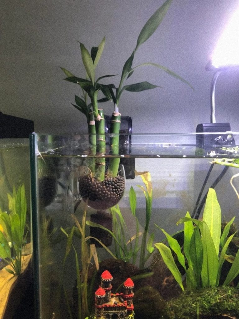 The stalks rise upward while the roots dip into the tank. What makes this unique is the floating planter—it saves bottom space for fish and other plants while letting the bamboo thrive.