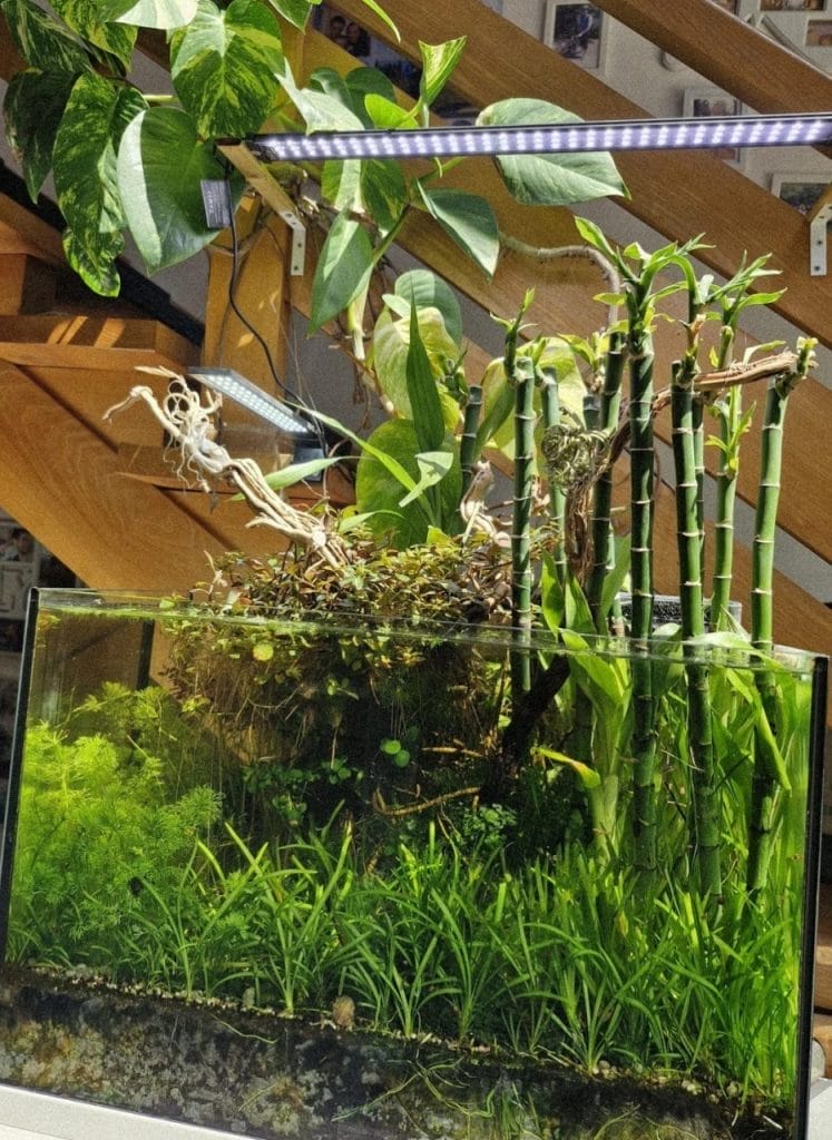 To copy this style, plant your bamboo stalks in one section of the tank, letting them grow above the waterline. Fill the base with carpeting plants like dwarf hairgrass, moss balls, and small ferns.