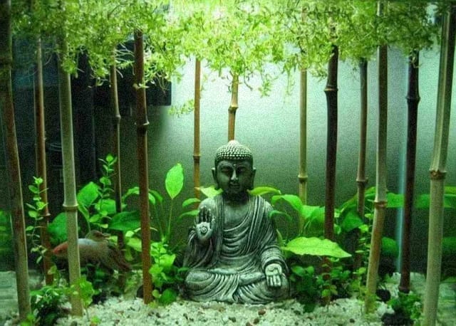 This setup feels like a calm meditation corner in your room. The Buddha statue in the gravel gives it a peaceful look, while the bamboo stalks stand tall in the middle as a natural divider.